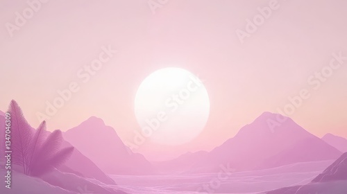 Pink Desert Sunset Landscape with Palm Leaves, and Minimal 3D Render.