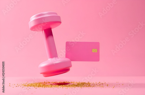 Pink fitness dumbbell with an empty card above golden sequins. Concept of buying a subscription and membership to the gym. Gift certificate for training and fitness