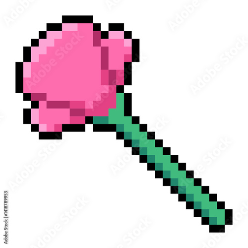 Pink Flower with Branch, Pixel Art Icon, Isolated