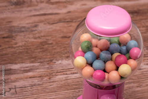 Pink gumball machine with a clear glass container full of colorful gumballs