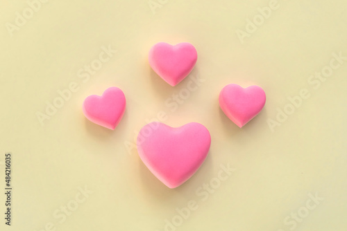 Pink hearts creative arrangement. Concept of love, romantic relationship symbol. 3d heart shape, on yellow background. Celebration of Valentine's Day or wedding.