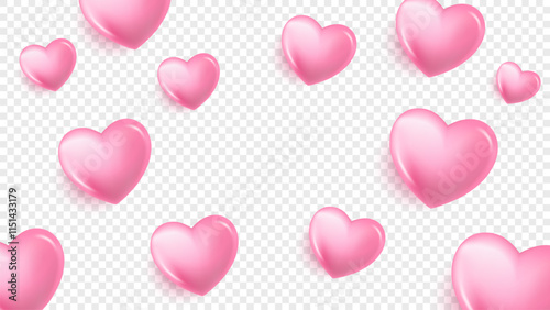 Pink hearts. Transparent background. Festive overlay template for Wedding Day invitations or Valentine's Day greetings. Vector illustration.