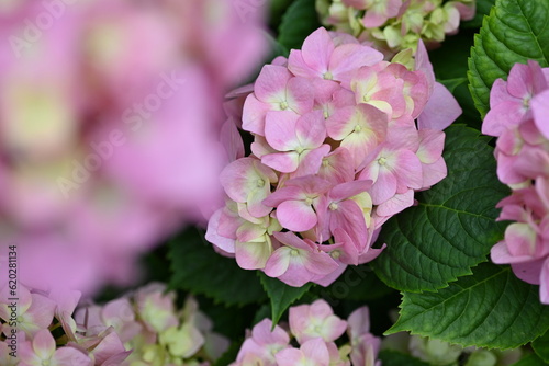pink hydrangea flowers on a bush as a background, green hydrangea branches with flowers