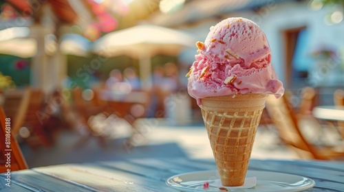 Pink ice cream cone sits on a table in front of a patio umbrella