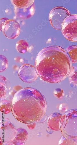 Pink iridescent bubbles float against a soft lavender sky