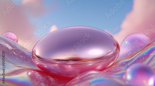 Pink iridescent sphere rests on a shimmering, abstract surface, surrounded by smaller bubbles against a pastel sky. Soft, dreamy lighting enhances the ethereal mood.