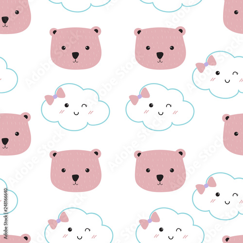 Pink kawaii seamless pattern with cloud and bear