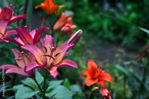 Pink lilies with drop blooming in the garden, beautiful flowers after the rain, background