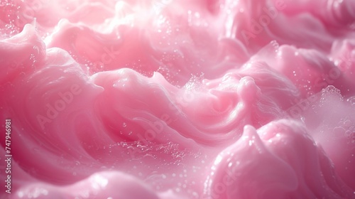 Pink liquid with bubbles and swirls on a surface in close up view, abstract background texture