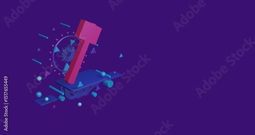 Pink mallet symbol on a pedestal of abstract geometric shapes floating in the air. Abstract concept art with flying shapes on the left. 3d illustration on deep purple background