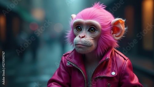 Pink monkey in leather jacket points, cool shades, hip, element