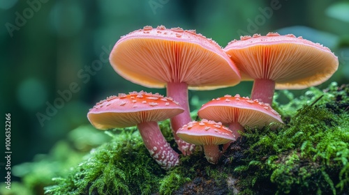 Pink mushrooms on mossy log in forest, macro photography. Nature and fungi exploration concept