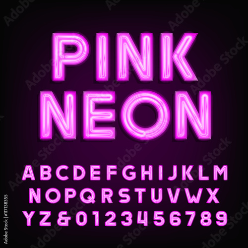 Pink neon tube alphabet font. Type letters and numbers on a dark background. Vector typeface for labels, titles, posters etc.