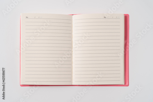 Pink notebook on white desk. Business minimal concept for women. Flat lay, top view, copy space
