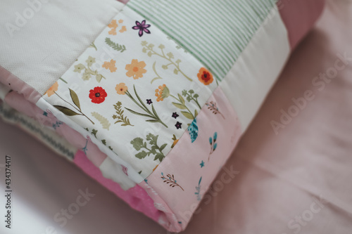 Pink patchwork blanket. Baby bedding. Bedding and textile for nursery. Nap and sleep time