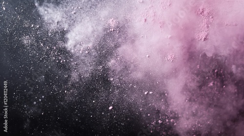 Pink powder explosion on dark background with fine particles and dust. Copy Space available for text placement.