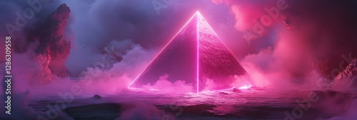 Pink Pyramid in a Mystical Landscape - A large pink pyramid glows with neon light in a surreal, misty landscape. Rocks and fog surround the structure, creating an atmospheric and mysterious scene