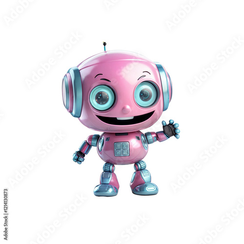 Pink Robot Buddy: A cheerful, cartoonish pink robot with large, expressive eyes and a friendly smile waves hello.