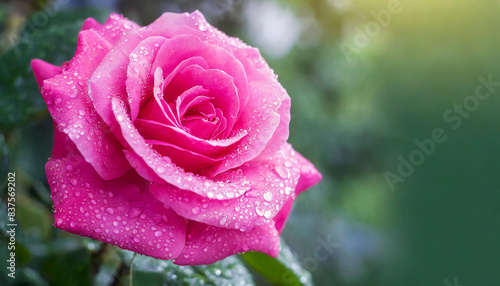 pink rose with delicate water droplets glistening on its petals, symbolizing love, beauty, and purity. Set against a soft background with ample space for a caption, perfect for banners or borders