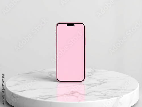 Pink smartphone with blank screen displayed on white marble pedestal against light gray background