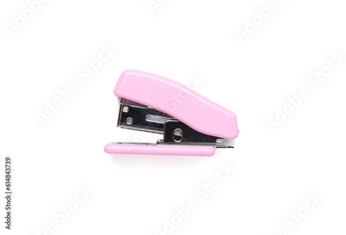 Pink stapler isolated on white, top view