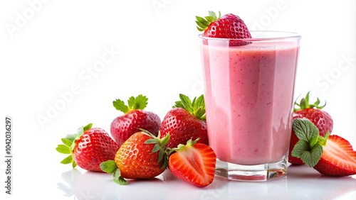 Pink strawberry smoothie in a glass with strawberries isolated on white background Close-Up