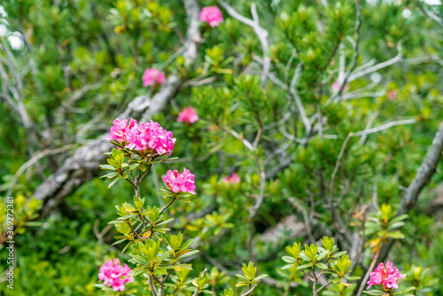 Pinkish-red alpenrose flowers in Dolomites, Italy
