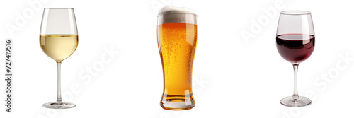 Pint of light beer with glass of white wine and glass with red wine