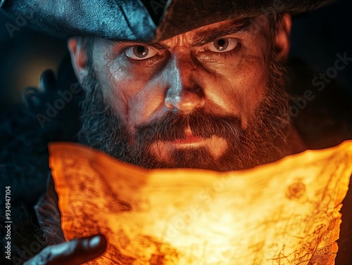 Pirate captain holding a glowing map, surrounded by haunted artifacts, 3D illustration