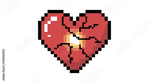 Pixel art depicting a broken heart with cracks and a bright center conveys heartbreak and lost love, ideal for digital projects on relationships and emotions