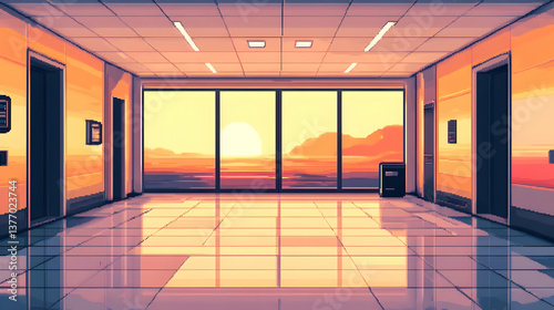 Pixel Art of a Modern Hallway with Elevator Doors and Orange Sunset Views Through Large Windows in a Minimalist Geometric Interior Design Setting