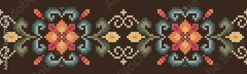Pixel art pattern with a floral design. The border is made up of squares and triangles. The colors are bright and the design is intricate