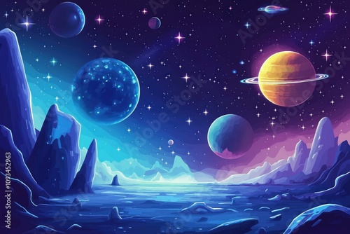 Pixel art space scene shows glowing stars planets, spaceship. Colorful planets float among glowing stars in outer space. Pixelated landscape with icy mountains. Scenic view of distant celestial
