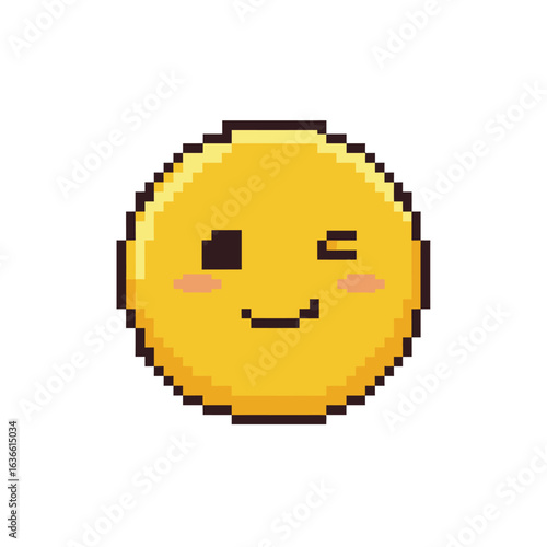 Pixel art winking smiley face emoji with a playful expression and blushing cheeks.