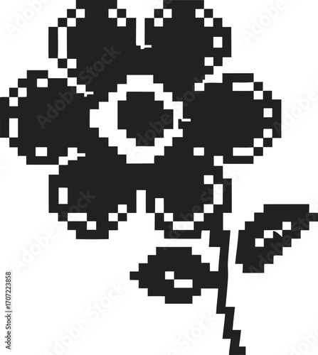Pixel flower icon retro black digital floral symbol, vintage 8 bit botanic motif with geometric petals and leaf