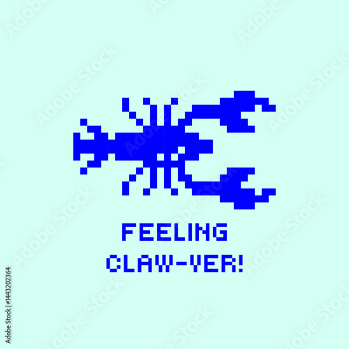 Pixel simple print with fun text Feeling clever. Wordplay. Lobster with Claws. Puzzle. Education vibe. Old school computer graphic style. Vector illustration. Blue color