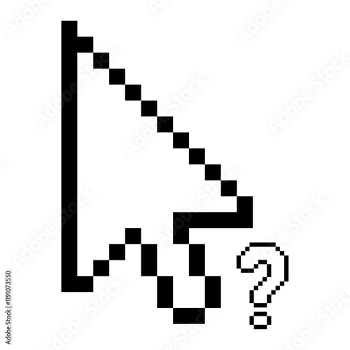 Pixelated Computer Cursor Icon, Black and White Pointer with Question Mark, Retro Digital Graphic Design Element, pixelated cursor with question mark, pixelated question mark.
