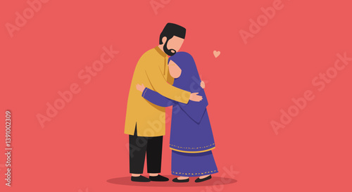 Pixelated Muslim Couple Embracing Against a Red Background Vector Illustration Depicting Affection and Love with Yellow and Blue Clothing