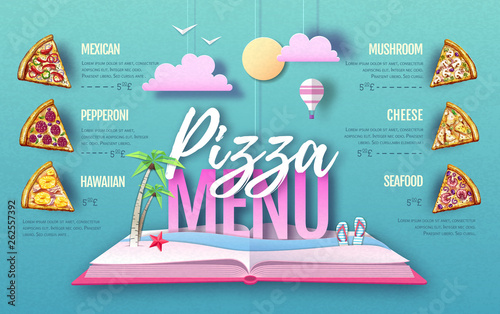 Pizza menu design. Cut out paper art style design. Origami