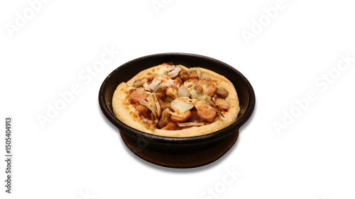 Pizza served on a hot plate isolated on a white background with space for text. Side view.