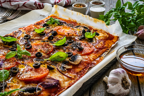 Pizza with white mushrooms, tomatoes, black olives, parmesan and mozzarella on wooden background