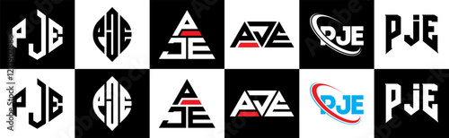 PJE letter logo design in six style. PJE polygon, circle, triangle, hexagon, flat and simple style with black and white color variation letter logo set in one artboard. PJE minimalist and classic logo