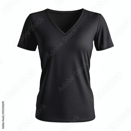 Plain black V-neck t-shirt 3D mockup showcasing front view for women's casual wear presentation on white background.