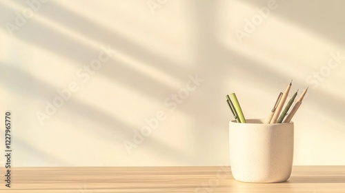plain ceramic cup holding pens placed on simple desk sharp focus on cup texture natural light enhancing minimalism