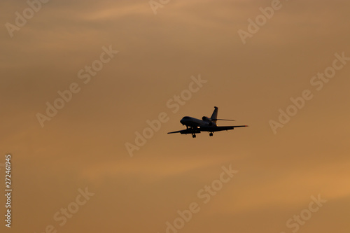 Plane preparing for landing with colorful sky at sunset