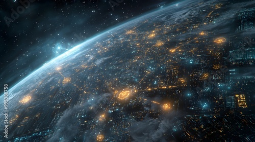 Planet Earth, city lights and cellular digital network growing binary data.