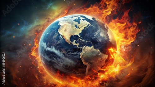Planet Earth consumed by raging inferno against transparent backdrop symbolizing catastrophic environmental disaster and devastating climate change consequences.