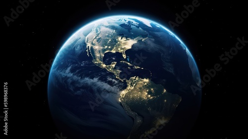 Planet Earth cutvature. Aerial view of blue planet from space. Sunrise over city lights. Generative AI