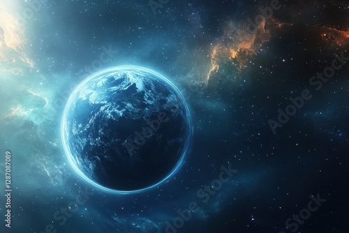 Planet Earth observed in a vast galaxy filled with stars and cosmic clouds