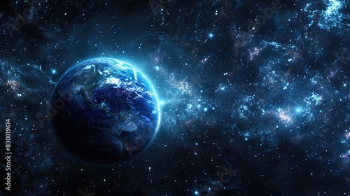 Planet Earth, seamlessly integrated into a futuristic data hologram screen against a dark blue background, creating a high-tech digital interface that showcases the world's geography from space.